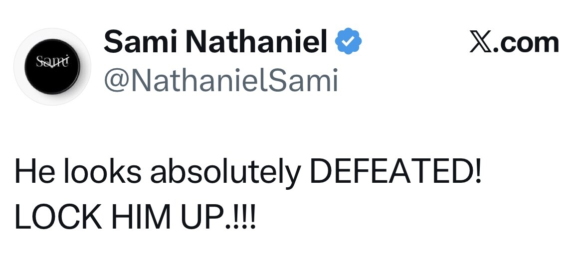 Sami Nathaniel's verified post on X.com with the username @NathanielSami. The message reads: "He looks absolutely DEFEATED! LOCK HIM UP !!!"