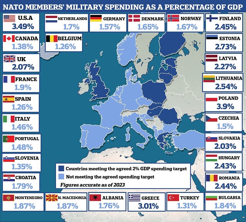 Map illustrating NATO members' military spending as a percentage of GDP as of 2023. The map uses shades of blue to differentiate between countries meeting the agreed 2% GDP spending target (in darker blue) and those not meeting the target (in lighter blue). Countries' percentages are listed alongside their national flags, including:
